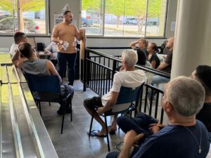 A discussão avançou para a análise da relação entre patriarcado, machismo e a cultura de violência contra a mulher. A escada serviu como metáfora visual para explicar como comportamentos aparentemente isolados estão conectados em um sistema que sustenta a violência de gênero. Segundo Aline Antunes, supervisora do serviço de alimentação, “a escada nos mostrou claramente que não existe ‘violência menor’. Cada degrau sustenta o próximo. Quando permitimos uma piada machista (primeiro degrau), estamos tornando mais fácil aceitar um controle sobre a roupa (segundo degrau), e assim por diante, até chegarmos aos degraus mais altos da violência física e do feminicídio.